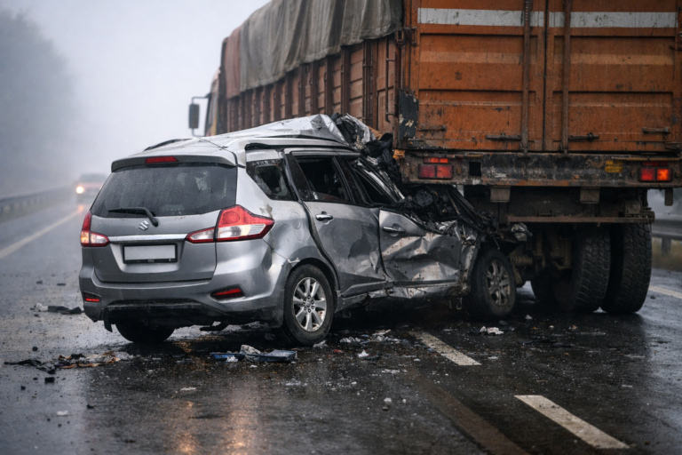 दिल्ली–मुंबई एक्सप्रेसवे पर भयंकर हादसा: कार ट्रक से लटकी, नोएडा के चार यात्रियों की दर्दनाक मौत