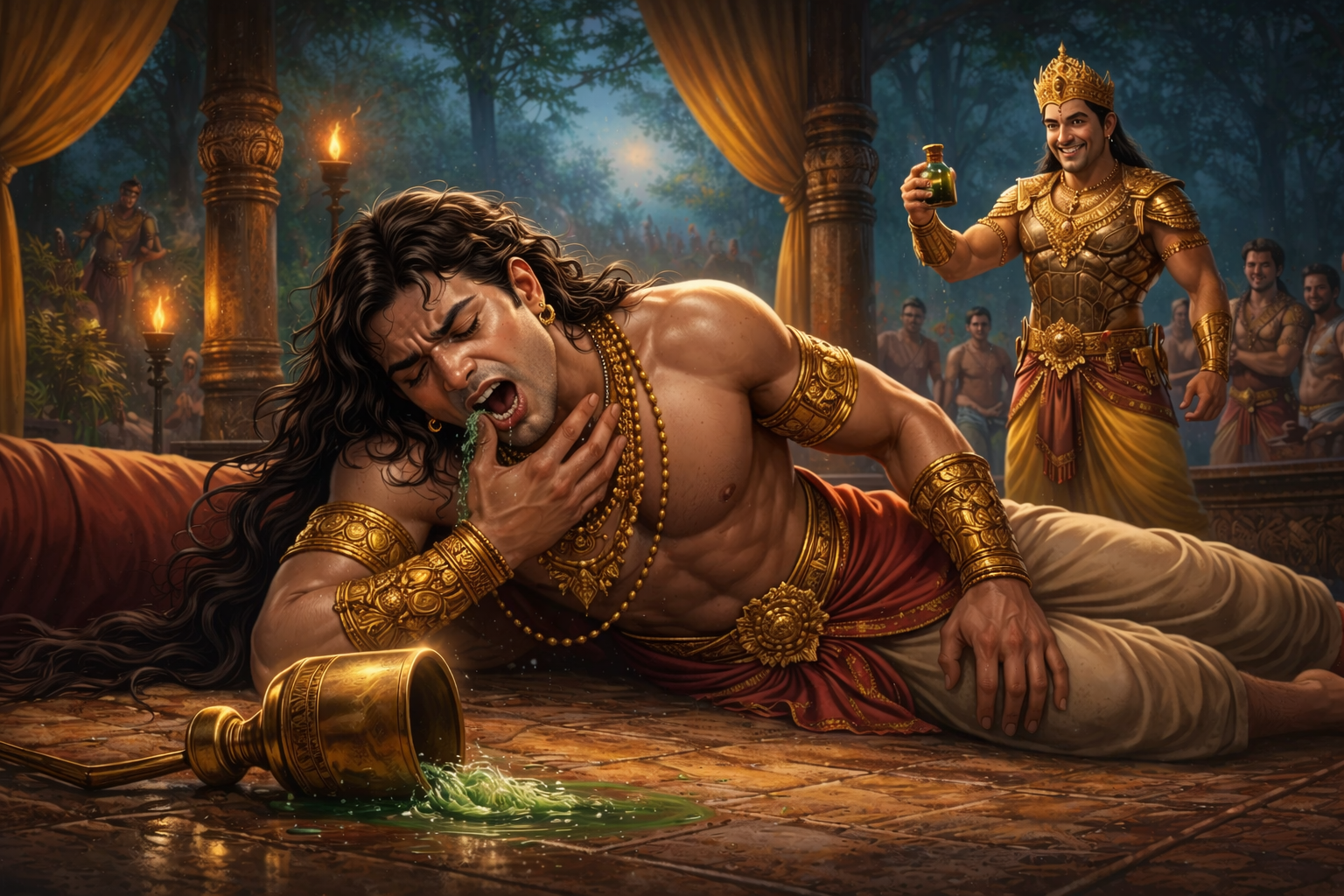 - घातक चाल: दुर्योधन ने भीम के भोजन (खीर/मोदक) में ‘कालकूट’ नामक अत्यंत प्रभावशाली विष मिलवा दिया।