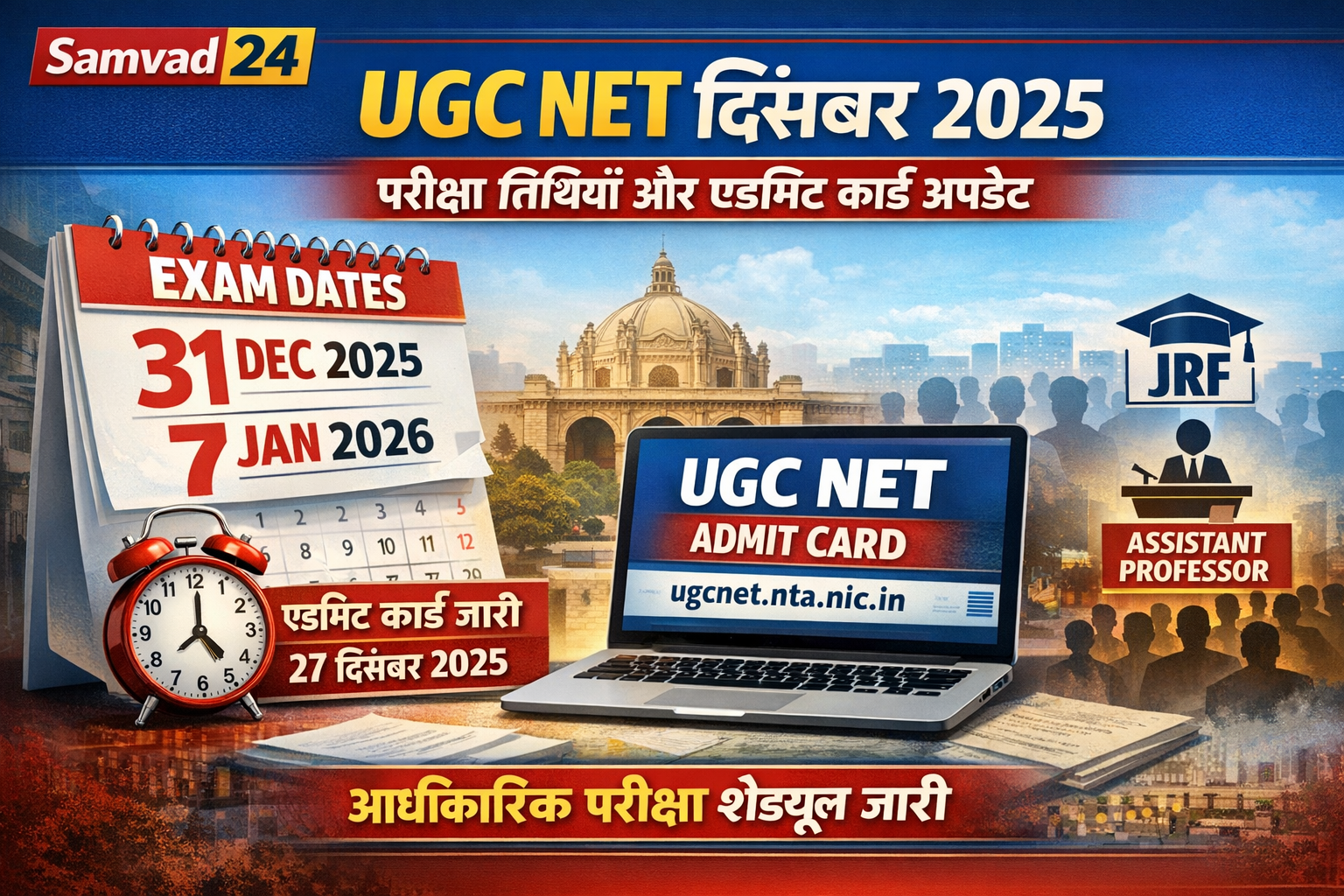 संवाद 24 नई दिल्ली। राष्ट्रीय परीक्षण एजेंसी (एनटीए) ने UGC NET दिसंबर 2025 सत्र का विषयवार परीक्षा कार्यक्रम और संबंधित तिथियों का आधिकारिक शेड्यूल जारी कर दिया है। इस राष्ट्रीय स्तर की परीक्षा में देशभर के उम्मीदवार 85 विषयों में भाग लेंगे और परीक्षा कंप्यूटर आधारित टेस्ट (CBT) मोड में आयोजित होगी।