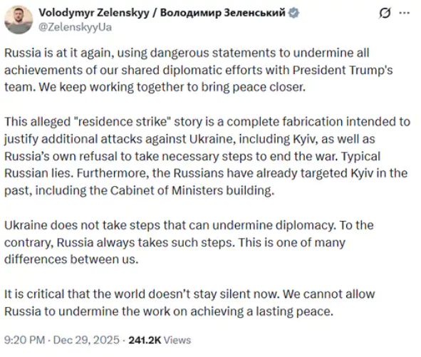 जेलेंस्की ने सोशल मीडिया प्लेटफॉर्म ‘एक्स’ पर पोस्ट कर कहा कि रूस जानबूझकर तनाव बढ़ा रहा है, जबकि यूक्रेन लगातार कूटनीतिक समाधान के पक्ष में खड़ा रहा है। उन्होंने कहा कि रूस युद्ध समाप्त करने के लिए आवश्यक कदम उठाने से इनकार कर रहा है और दुनिया को इस झूठे नैरेटिव के खिलाफ चुप नहीं रहना चाहिए।