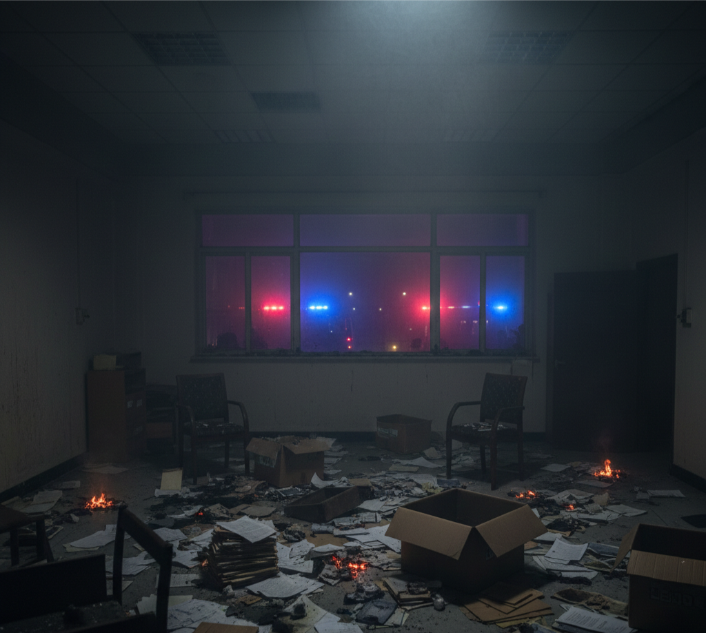 धुएं के गुबार और रिकॉर्ड रूम की तबाही