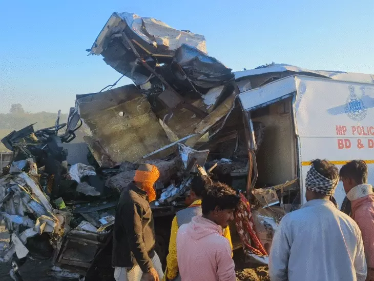 MP के सागर में भीषण हादसा: पुलिस वैन और कंटेनर की टक्कर में 4 जवान शहीद, एक गंभीर; वाहन काटकर निकाले गए शव