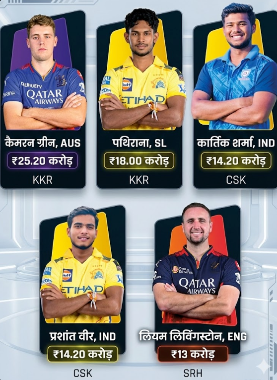 इस ऑक्शन में युवा अनकैप्ड भारतीय खिलाड़ियों पर भी जमकर पैसा बरसा। चेन्नई सुपर किंग्स (CSK) ने 20 वर्षीय प्रशांत वीर और 19 वर्षीय कार्तिक शर्मा को ₹14.20-₹14.20 करोड़ में खरीदा। दोनों की बेस प्राइस मात्र ₹30 लाख थी, यानी CSK ने इन पर करीब 47 गुना ज्यादा रकम खर्च की। CSK ने इन दोनों खिलाड़ियों पर कुल ₹28.40 करोड़ झोंके।