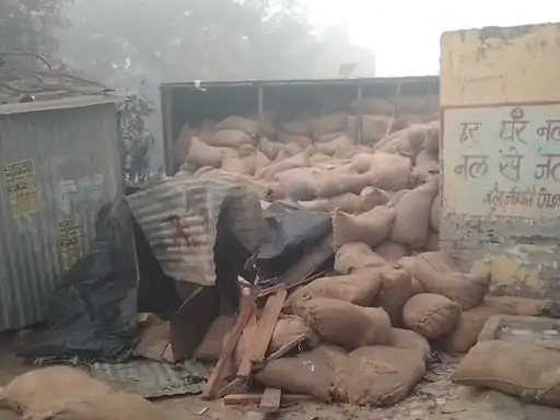 धान से भरा ट्रक पलटा, सात दुकानों को नुकसान, कोहरे के चलते हुआ हादसा, करीब दो लाख रुपये की क्षति