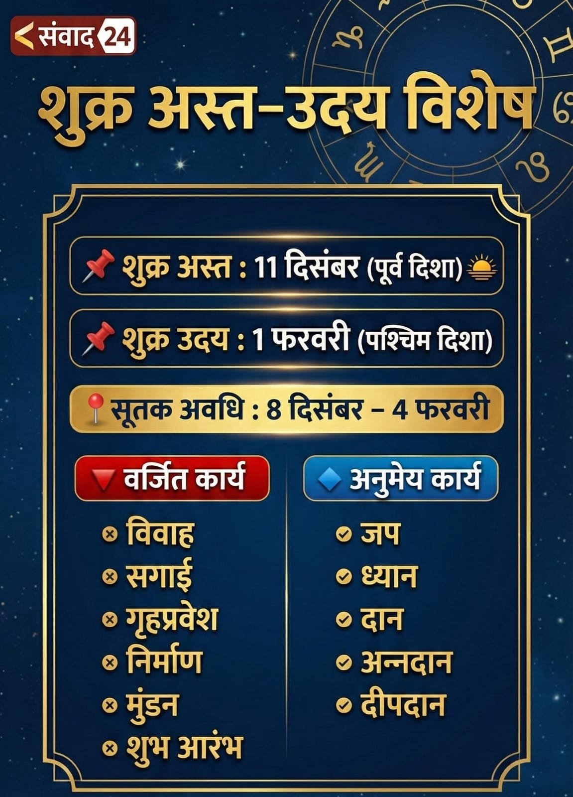 खगोलीय गणना के अनुसार 11 दिसंबर को शुक्र पूर्व दिशा में अस्त होगा। अस्त अवधि को “ग्रह-दुर्बलता” कहा गया है, जिसमें ग्रह के शुभ प्रभाव क्षीण हो जाते हैं।