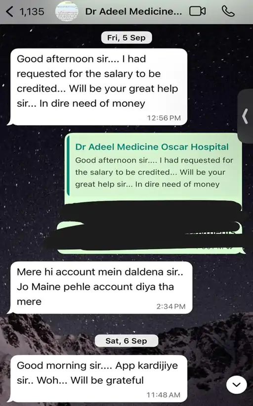 जांच एजेंसियों ने उसकी वॉट्सऐप चैट भी बरामद की है, जिसमें आदिल अस्पताल प्रबंधन के सामने एडवांस सैलरी के लिए गिड़गिड़ाता दिखा। चैट में उसने लिखा—