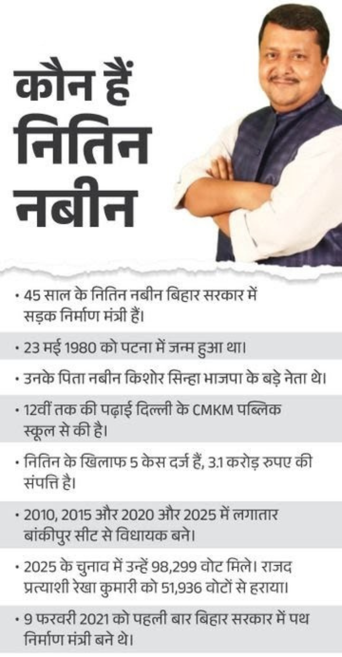 45 वर्षीय नितिन नबीन वर्ष 2010 से लगातार बांकीपुर विधानसभा सीट से विधायक हैं और बिहार सरकार में मंत्री के रूप में भी सेवाएं दे चुके हैं। पार्टी सूत्रों के अनुसार, वे नए राष्ट्रीय अध्यक्ष के चुनाव तक यह जिम्मेदारी संभालेंगे। उल्लेखनीय है कि भाजपा ने वर्ष 2020 में जेपी नड्डा को राष्ट्रीय अध्यक्ष नियुक्त किया था। 2024 में उनका कार्यकाल समाप्त हो गया था, जिसके बाद वे विस्तार (एक्सटेंशन) पर थे। वर्तमान में जेपी नड्डा केंद्र सरकार में स्वास्थ्य मंत्री हैं।