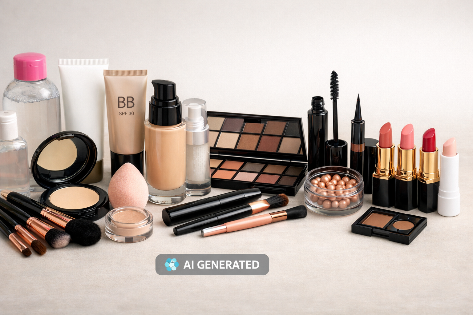 क्लेंज़र, मॉइस्चराइज़र, सनस्क्रीन, प्राइमर, फाउंडेशन या बीबी क्रीम, कंसीलर, कॉम्पैक्ट पाउडर, ब्लश, काजल, मस्कारा, आइब्रो पेंसिल, लिप बाम और लिपस्टिक जैसे उत्पाद मिलकर एक पूर्ण मेकअप किट तैयार करते हैं।