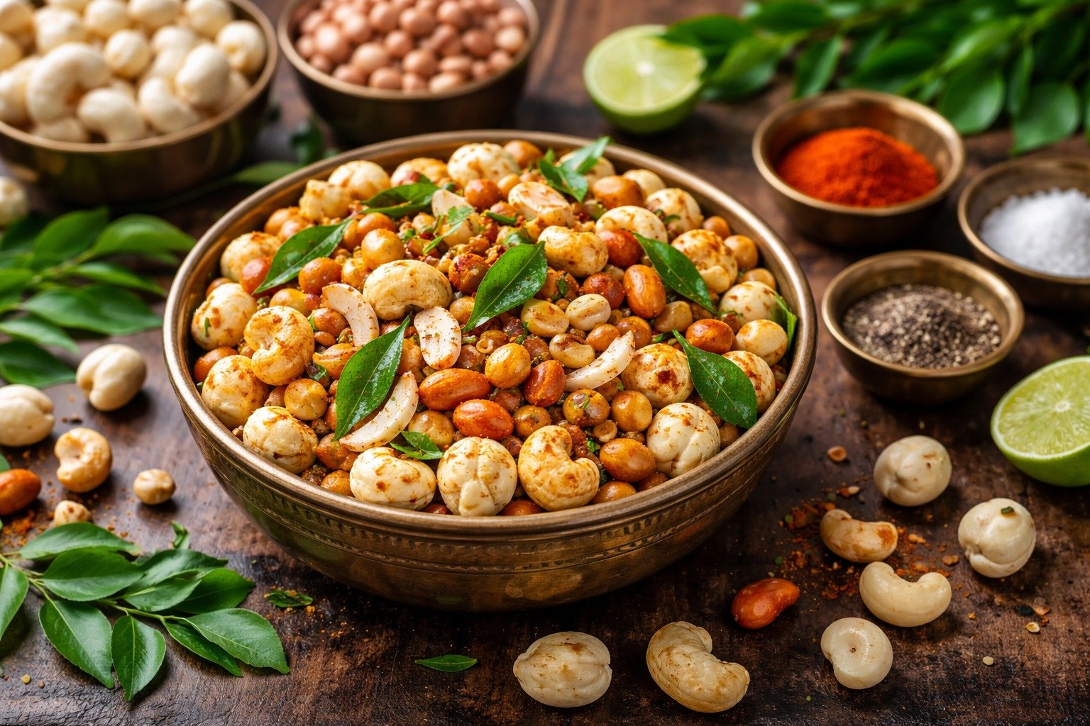 अब कढ़ाही में बचा हुआ घी डालें और उसमें सूखा नारियल हल्का सा भून लें। इसके बाद इसमें करी पत्ते डालें (यदि उपयोग कर रहे हों)। जब करी पत्ते क्रिस्प हो जाएं, तब इसमें सभी भूने हुए मखाने, मूंगफली और मेवे डाल दें।